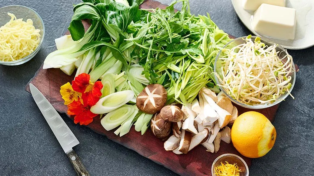 Očistěte houby a nakrájejte je na kousky. Omyjte rukolu a klíčky. Bílou část pórku jemně nasekejte. Zbylou část podélně nařízněte z obou stran, opláchněte, abyste odstranili nečistoty, a nakrájejte na šikmé plátky. Čínské zelí pak choi rozkrojte podélně na 8 dílů a tofu nakrájejte na 8 kusů.