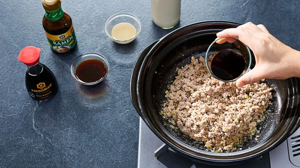 V hrnci rozehřejte Kikkoman Sezamový olej. Přidejte nasekaný česnek, zázvor, pórek, sečuánský pepř a drcené chilli a míchejte, dokud se nerozvine aroma. Poté přidejte mleté maso a restujte, dokud nezezlátne. Přidejte tahini, Kikkoman Sójovou omáčku, Kikkoman Základ na ramen, sůl a sojové mléko. Dobře promíchejte.