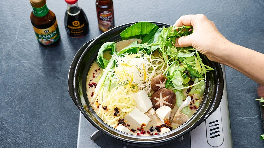 2 polévkové lžíce Kikkoman Pražený sezamový olej – 1 polévková lžíce nasekaného česneku – 1 polévková lžíce nasekaného zázvoru – nasekaného pórku – 1 čajová lžička mletého sečuánského pepře – ½ čajové lžičky chilli vloček – 300 g mletého masa (libovolného druhu) – 2 polévkové lžíce tahini – 3 polévkové lžíce Kikkoman Koncentrovaný základ pro ramen – 2 polévkové lžíce Kikkoman Sójová omáčka přirozeně fermentovaná tekuté ochucovadlo – 2 čajové lžičky soli – 1 l neslazeného sojového mléka