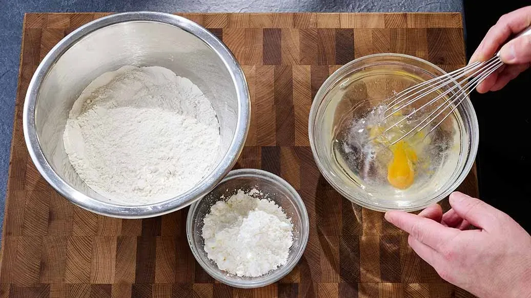 Na těstíčko prošlehejte perlivou vodu s vejcem. Mouku smíchejte s kukuřičným škrobem a postupně do ní zašlehejte vaječnou směs. Hotové těstíčko nechte vychladit.