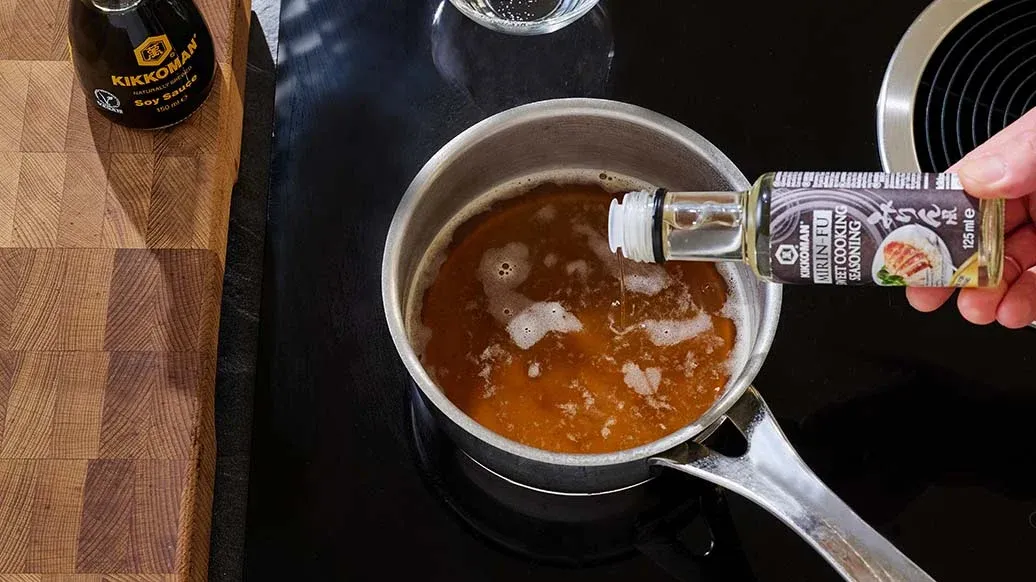 Smíchejte vývar, Kikkoman Sójovou omáčku, Kikkoman Mirin sladké dochucovadlo a cukr. Zahřejte, ale těsně před bodem varu stáhněte z plotny a nechte stranou. Ředkev a zázvor oloupejte, najemno nastrouhejte a důkladně nechte okapat v sítu.