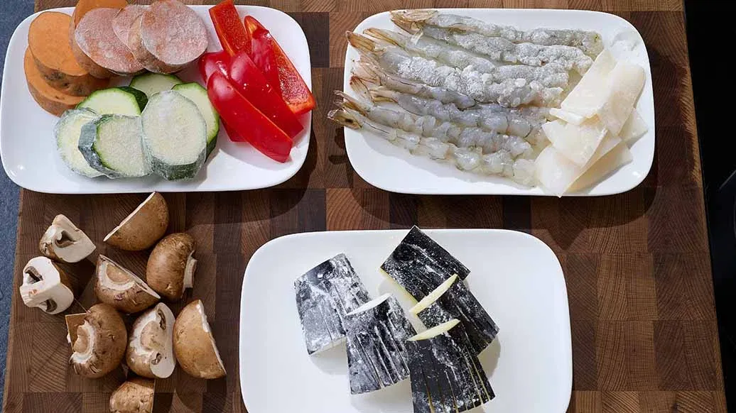 Kalamáry nakrájejte na kousky o velikosti 2 × 4 cm. Krevety osušte papírovou utěrkou. Shiitake houby rozkrojte napůl. Červenou papriku nakrájejte na kousky o velikosti 2 × 4 cm. Cuketu a batát nakrájejte na plátky silné přibližně 8 mm. Lilek podélně rozkrojte na čtyři části a slupku jemně nařízněte šikmými zářezy.