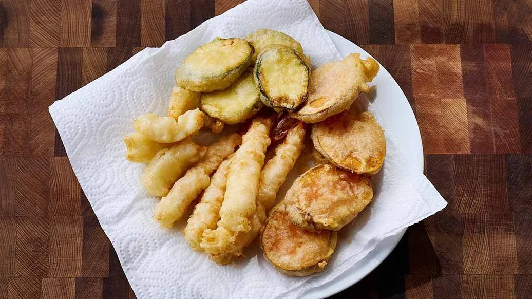 Můžete použít i vodu z kohoutku, pokud nemáte perlivou. Minerální perlivá voda však pomáhá vytvořit těstíčko, které je při smažení extra lehké a křupavé.