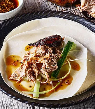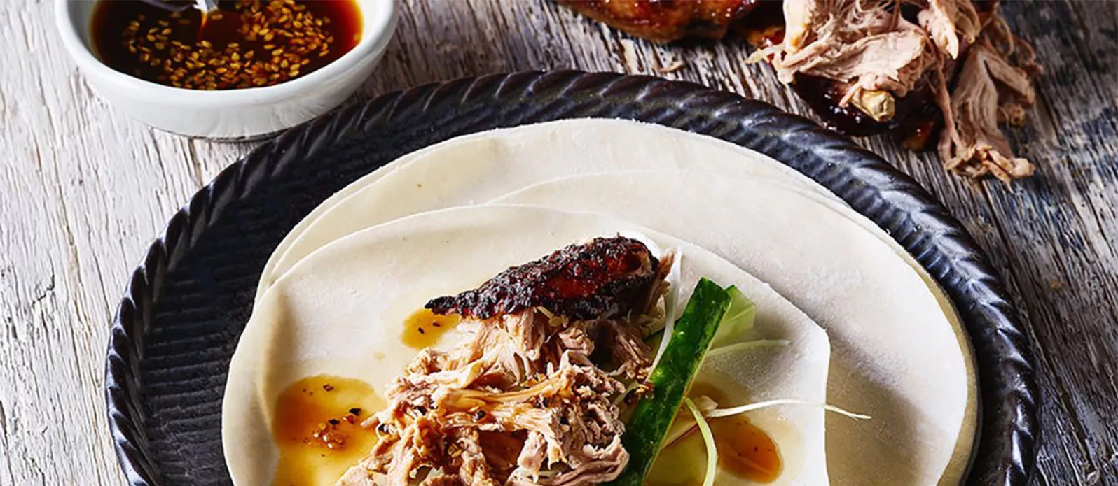 Připravte čínské palačinky podle pokynů na obalu. Podávejte s natrhanou kachnou, jarní cibulkou, okurkou a Kikkoman Teriyaki sezam omáčkou, kterou si můžete přidat podle chuti.