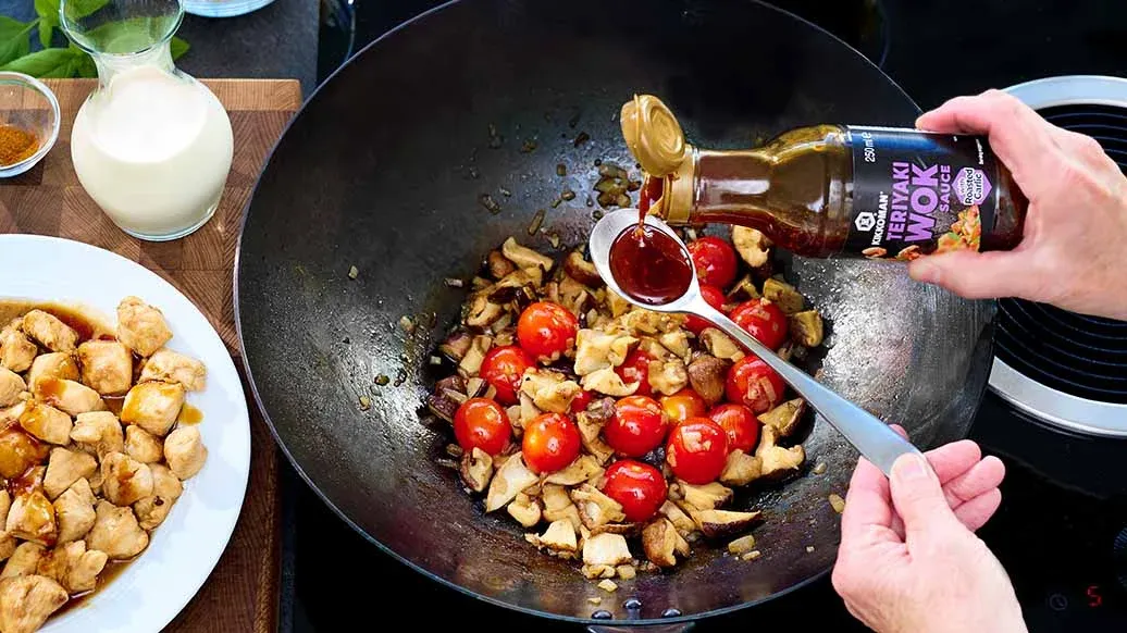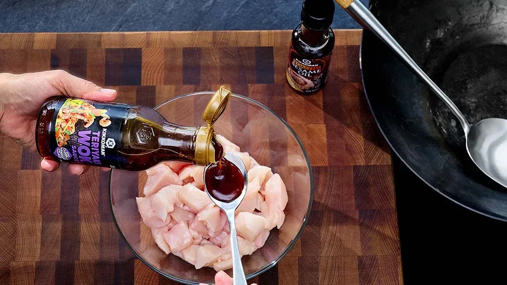 Kuřecí prsní filet nakrájejte na kostičky nebo proužky a asi 5 minut ho marinujte v Kikkoman Teriyaki Wok omáčce s pečeným česnekem.