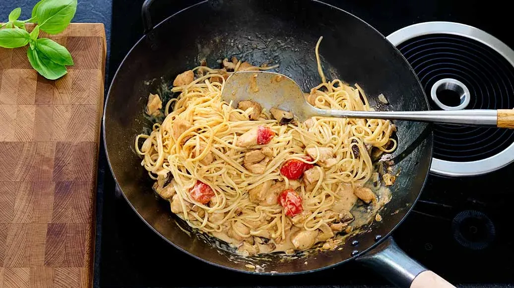 Omáčku promíchejte s těstovinami a kuřecím masem přímo ve woku, rozdělte na talíře, ozdobte bazalkou a podávejte.