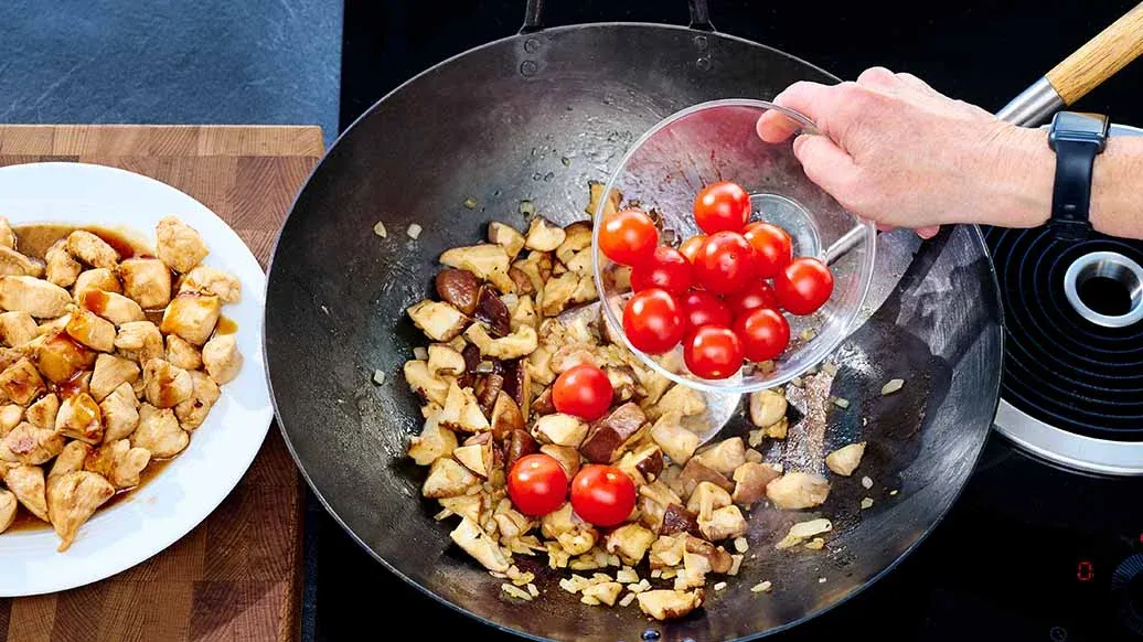 Ve woku rozehřejte Kikkoman sezamový olej a kuřecí maso opékejte asi 8 minut a poté vyjměte.