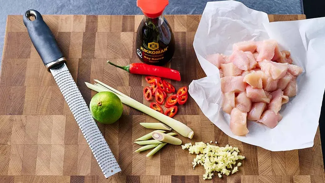Citrónovou trávu nakrájejte na menší kousky. Zázvor oloupejte a najemno nastrouhejte nebo nasekejte. Z limetky nastrouhejte kůru a vymačkejte šťávu. Chilli papričku nakrájejte na kolečka. Kuřecí maso nakrájejte na malé kostičky.