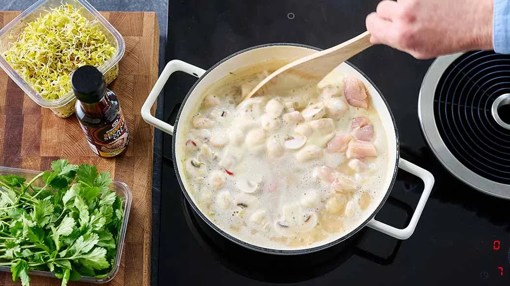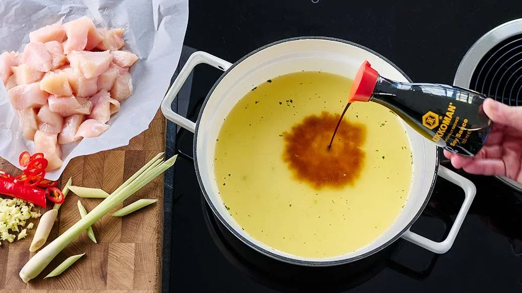 Přiveďte kuřecí vývar s Kikkoman Sójovou omáčkou k varu. Přidejte citrónovou trávu, zázvor, trochu limetkové kůry a šťávy, chilli, kokosové mléko a cukr. Vše prohřejte.