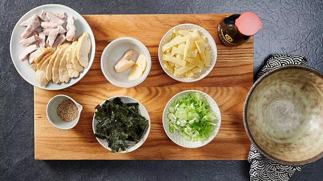 Bambusové výhonky sceďte. Jarní cibulku a nori nakrájejte na tenké proužky. Zázvor oloupejte a nakrájejte na 4 tenké plátky (jeden na porci).Opražte sezamová semínka na pánvi, dokud nezezlátnou a nerozvoní se. Vepřové a kuřecí maso nakrájejte na plátky.