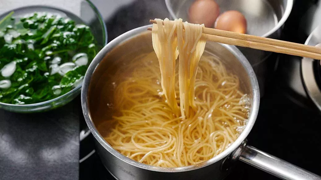 Nudle uvařte al dente a opláchněte pod studenou vodou. Špenát 1 sekundu blanšírujte a poté ponořte do ledové vody. Pomocí jehly jemně propíchněte skořápky vajec. Vložte je do vařící vody a vařte 6 minut, dokud nebudou na hniličku. Slijte horkou vodu a vejce zchlaďte pod studenou vodou.