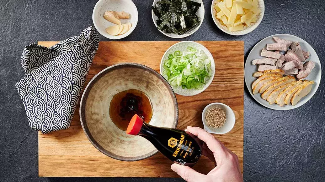 Do předehřátých misek nalijte 1 lžíci Kikkoman Sójové omáčky a 1 lžíci rybí omáčky. Rozdělte připravené ingredience do misek a zalijte je vařícím vývarem.