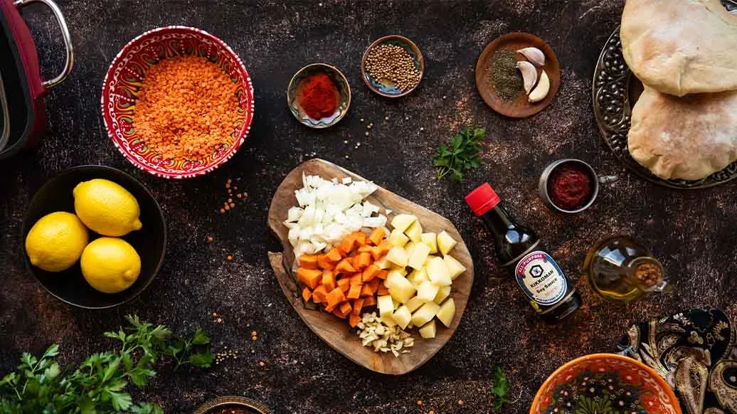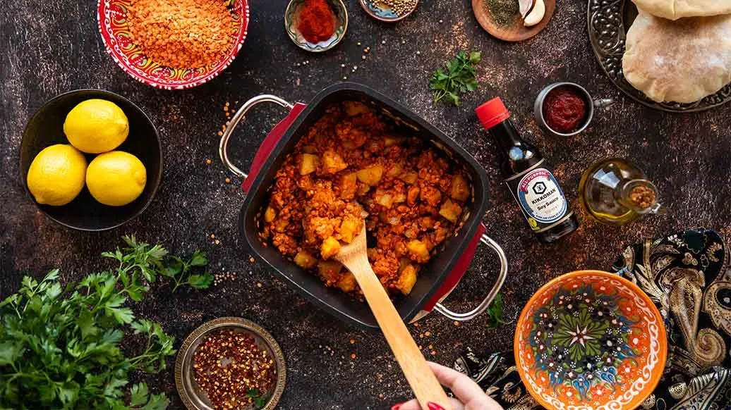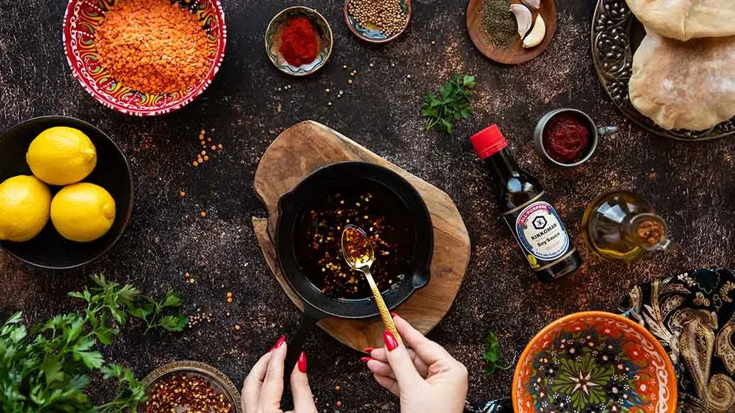 Hřejivá polévka z červené čočky, mrkve, brambor a česneku, vařená s kořením a rajčatovým protlakem. Sójová omáčka Kikkoman jí dodává bohatou umami hloubku, zatímco máta, petržel, čili a citron jí propůjčují svěží a výraznou chuť.