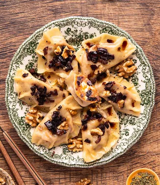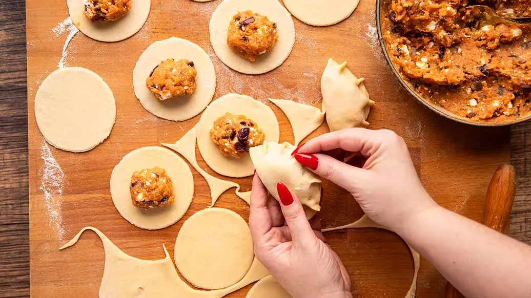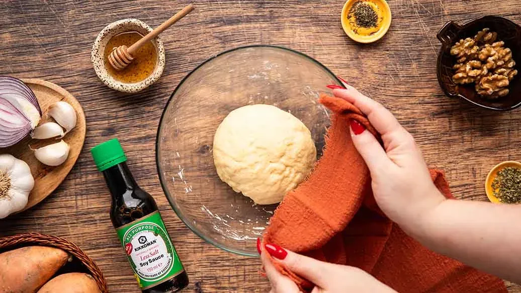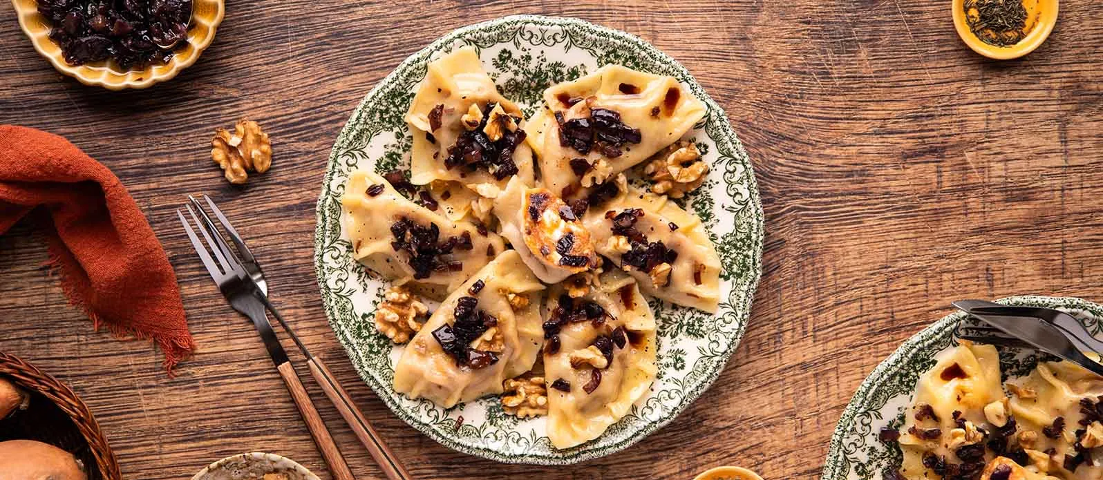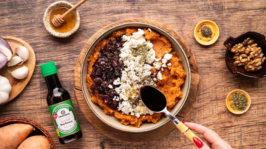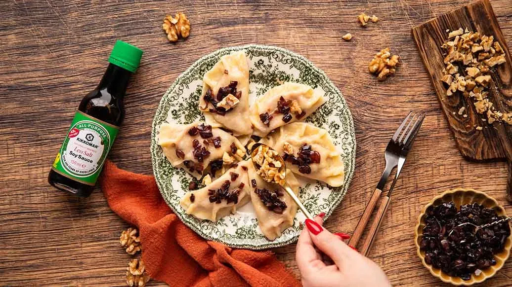 Pierohi trochu jinak — plněné batáty, fetou a karamelizovanou cibulí. Kapka Kikkoman Sójové omáčky se sníženým obsahem soli dodá chuť umami a nasekané vlašské ořechy osvěží příjemnou křupavostí.
