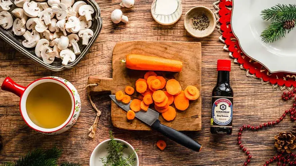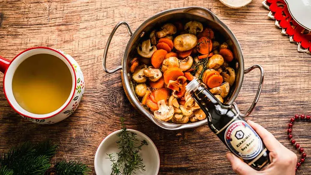 Bohaté, aromatické ragú z hub a mrkve, pomalu dušené v tmavém pivu se Sójovou omáčkou Kikkoman, zjemněné smetanou. Sytý vegetariánský hlavní chod, ideální v kombinaci s pečenými brambory, kterým o svátcích potěšíte nejen vegetariány.