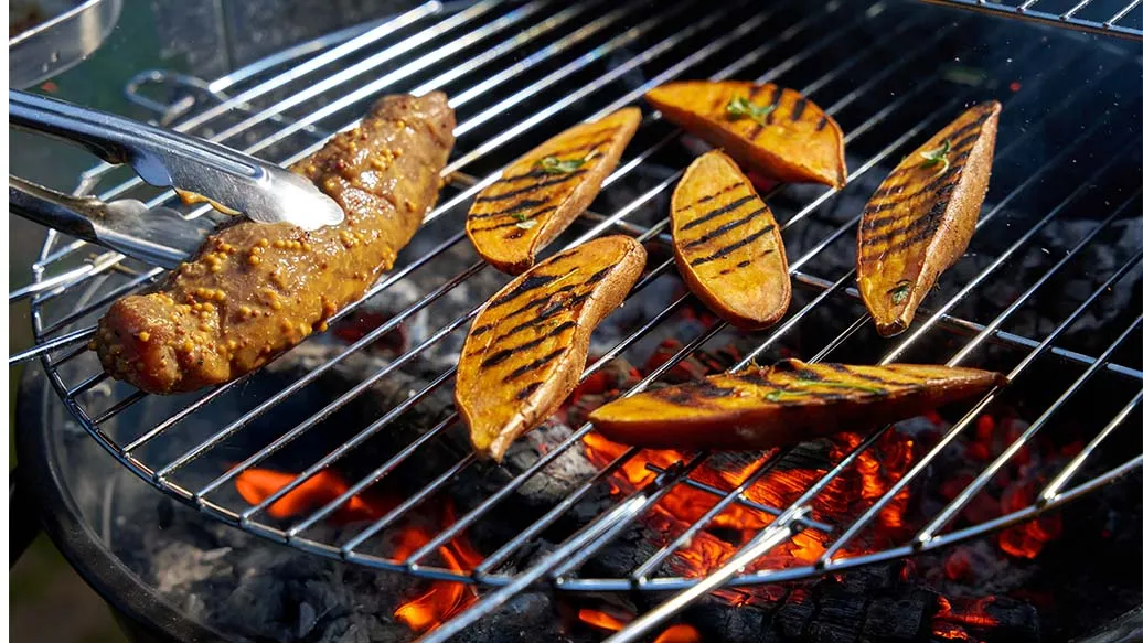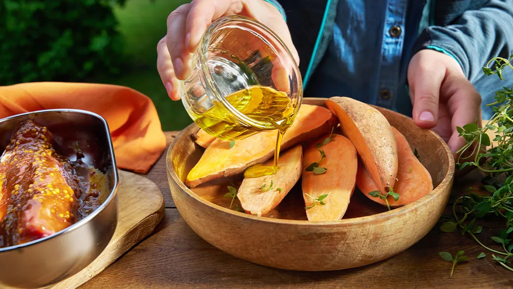 Batáty omyjte a rozkrojte napůl. Zakápněte olivovým olejem, přidejte tymián a grilujte přibližně 30 minut, dokud nezměknou, na grilu nebo grilovací pánvi.