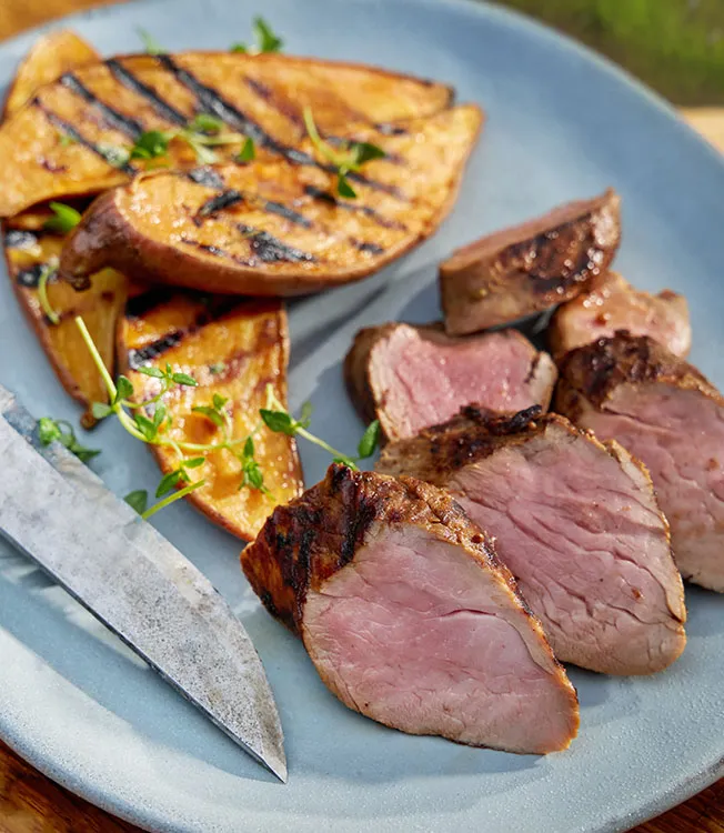 Marinovanou panenku grilujte ze všech stran přibližně 12–15 minut, dokud nebude propečená, na grilu nebo grilovací pánvi. Před krájením nechte maso 3 minuty odpočinout. Podávejte s pečenými batáty a odloženou směsí jako omáčkou.
