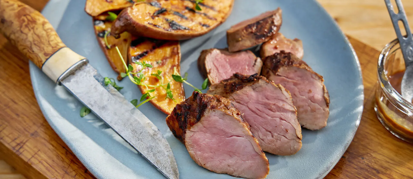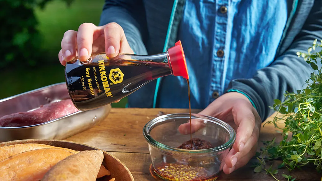 Šťavnatá vepřová panenka marinovaná v hořčici, miso pastě a Sójové omáčce Kikkoman, podávaná s pečenými batáty a tymiánem.