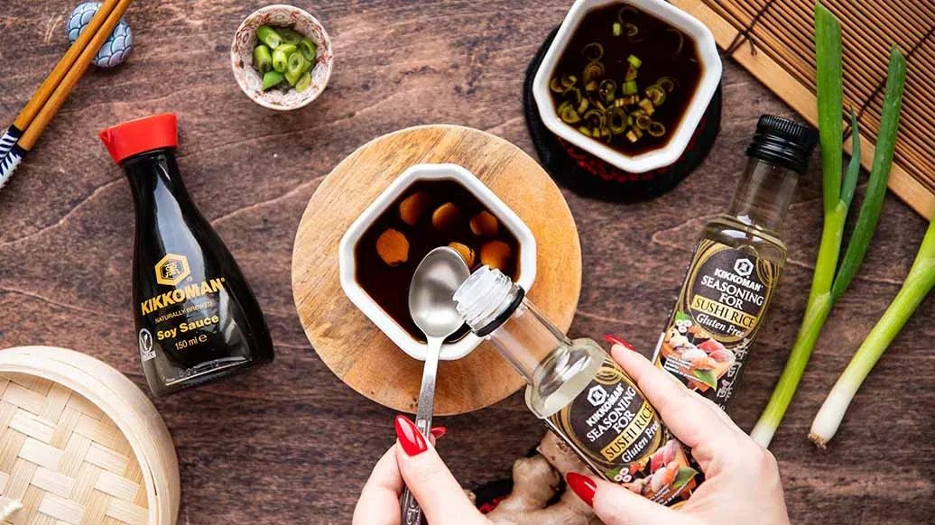 3 polévkové lžíce Kikkoman Citrónová ponzu omáčka – ½ polévkové lžíce Kikkoman Pražený sezamový olej – ½ cm čerstvého zázvoru, nastrouhaného – ½ polévkové lžíce najemno nasekané jarní cibulky – 3 polévkové lžíce Kikkoman Sójová omáčka přirozeně fermentovaná tekuté ochucovadlo – 1 čajová lžička Kikkoman Dochucovadlo na sushi rýži (125ml) – 1 cm čerstvého zázvoru, nakrájeného na plátky