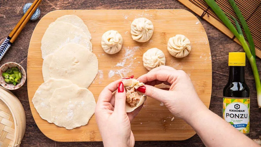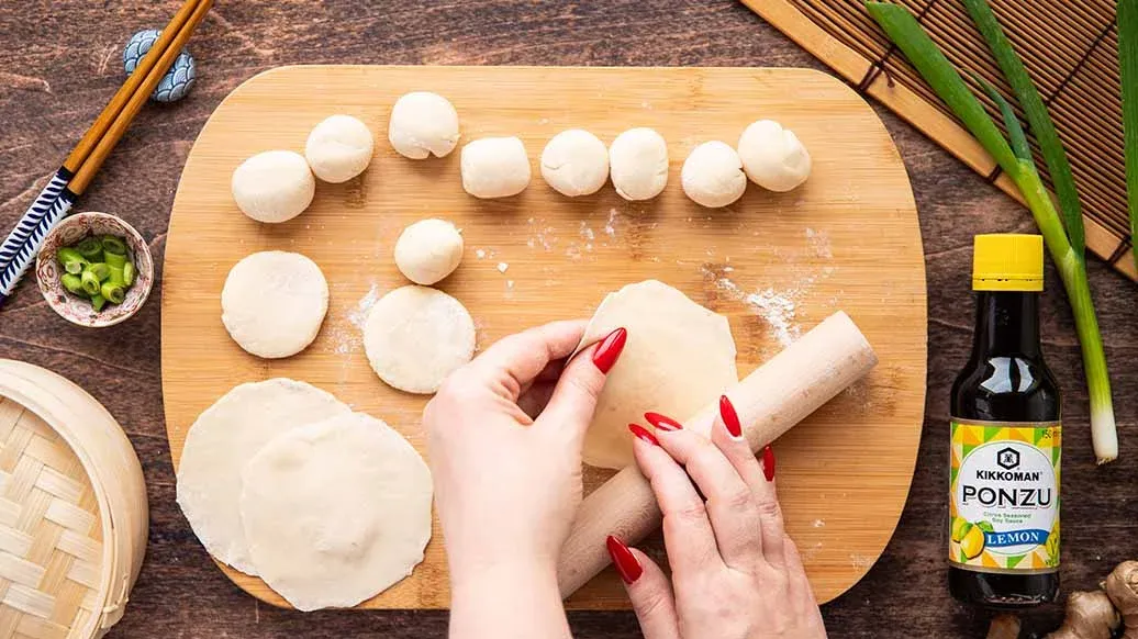 V jedné misce promíchejte Kikkoman Ponzu Lemon, Kikkoman Pražený sezamový olej, nastrouhaný zázvor a jarní cibulku. V druhé misce smíchejte Kikkoman Sójovou omáčku, Kikkoman Dochucovadlo na sushi rýži a plátky zázvoru. Horké knedlíčky podávejte s oběma dipy.