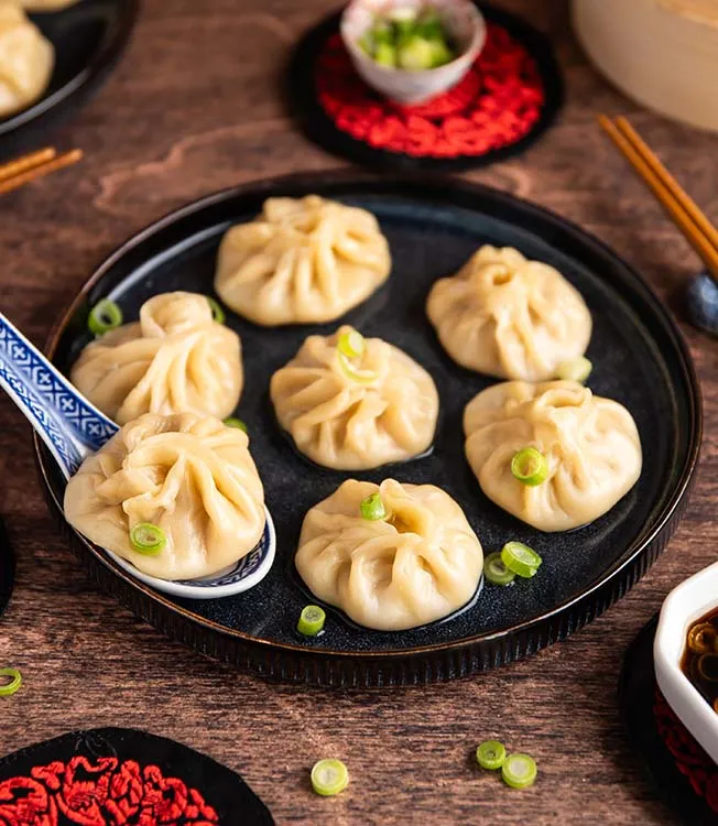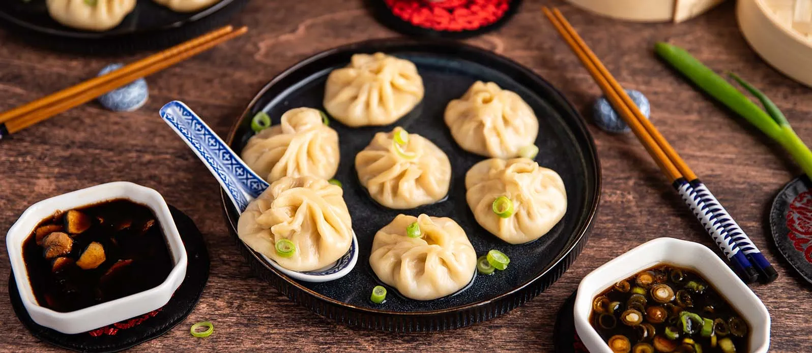 Napařované Xiao Long Bao – jemné čínské polévkové knedlíčky – plněné kuřecím masem, krevetami a horkým vývarem. Sójové dipy dodávají hloubku umami a lahodně slaný finiš. Vydatné jídlo, které opravdu zahřeje.