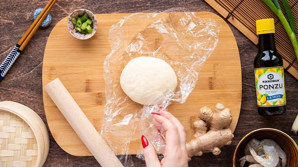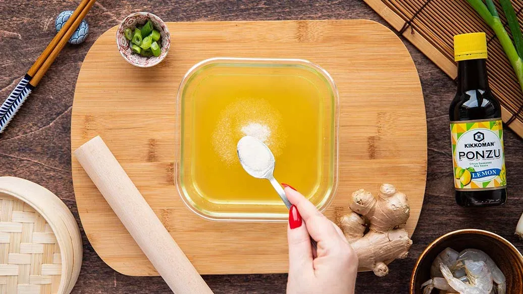 V míse promíchejte kuřecí maso, krevety, jarní cibulku, zázvor, Kikkoman Ponzu citrón, Kikkoman Sezamový olej, cukr a pepř. Ztuhlý vývar nakrájejte na malé kostičky a opatrně jej vmíchejte do náplně.