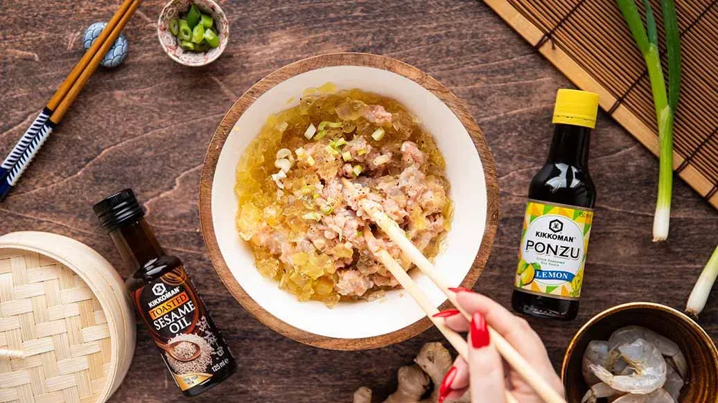 150 g mletého kuřecího masa – 50 g najemno nasekaných krevet – 1 jarní cibulka – 1 cm čerstvého zázvoru, nastrouhaného – 1 polévková lžíce Kikkoman Citrónová ponzu omáčka – ½ polévkové lžíce Kikkoman Pražený sezamový olej – ½ čajové lžičky cukru – ¼ čajové lžičky čerstvě mletého pepře