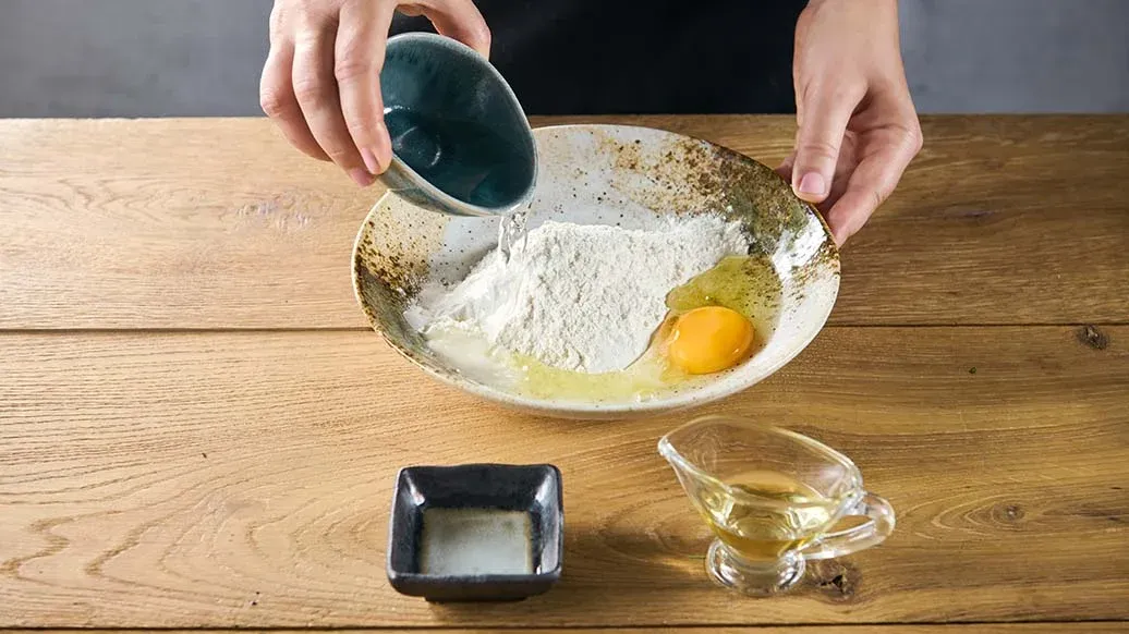 30 ml řepkového oleje – 150 g pšeničné mouky – 1 čajová lžička rýžového octa – 30 ml vody