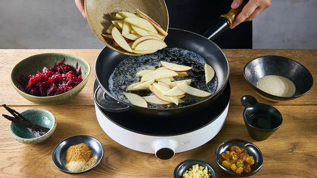1 vařená červená řepa – 1 jablko – 40 g rozinek – 40 g másla – 40 ml Kikkoman Mirin sladké dochucovadlo – 30 ml Kikkoman Sójová omáčka přirozeně fermentovaná tekuté ochucovadlo – 1 špetka mleté skořice – 1 špetka mletého kardamomu – 1 polévková lžíce vanilkového extraktu – 1 čajová lžička zázvoru – 40 g krupice