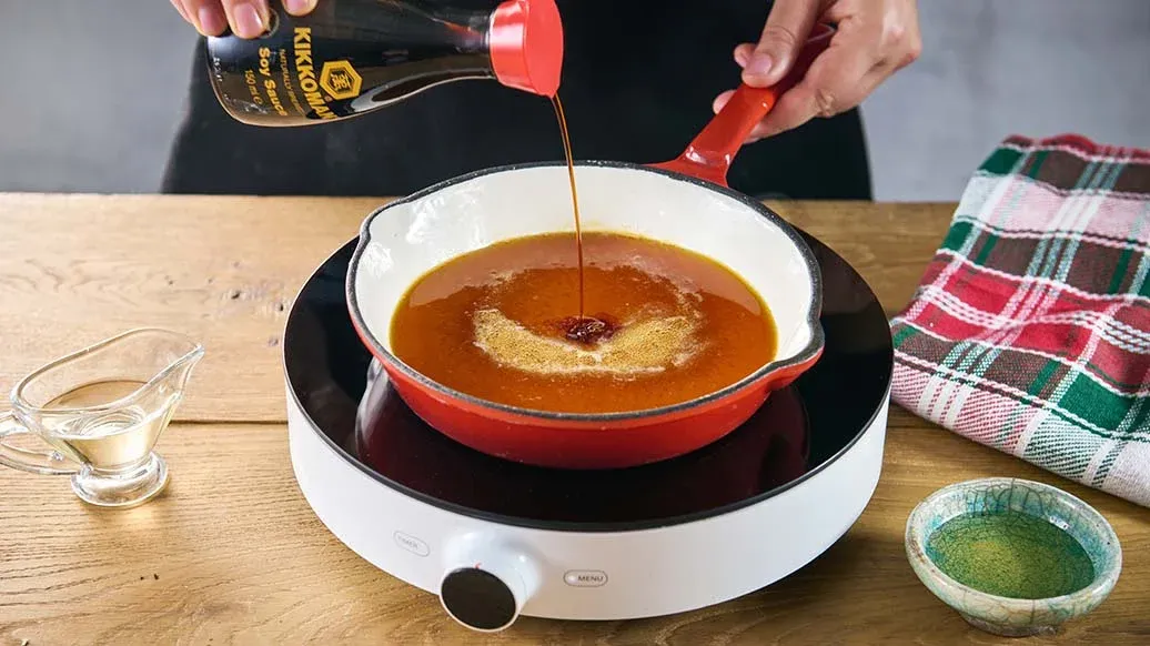 20 ml Kikkoman Sójová omáčka přirozeně fermentovaná tekuté ochucovadlo – 60 ml medu – 30 ml Kikkoman Mirin sladké dochucovadlo – 20 ml saké